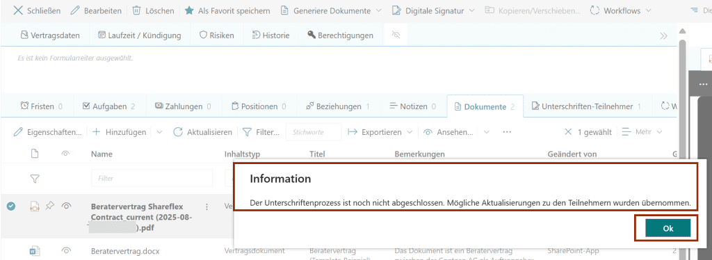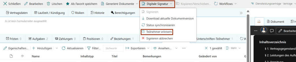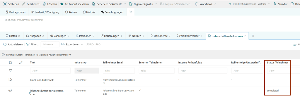 With the Shareflex DigitalSign module, users can manage signature participants directly in the Shareflex web interface. The secondary list in the contract/document file provides a clear overview of all participants and their status.