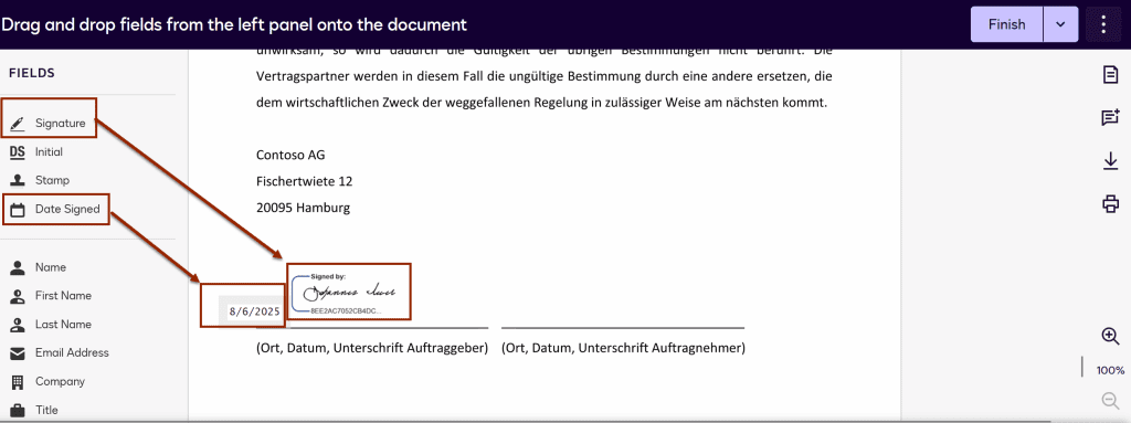 Use the author page to place signature fields precisely in the provider portal (Adobe Sign or DocuSign). This is useful for